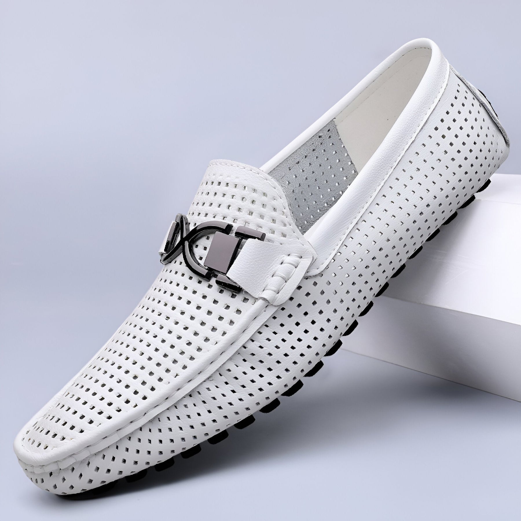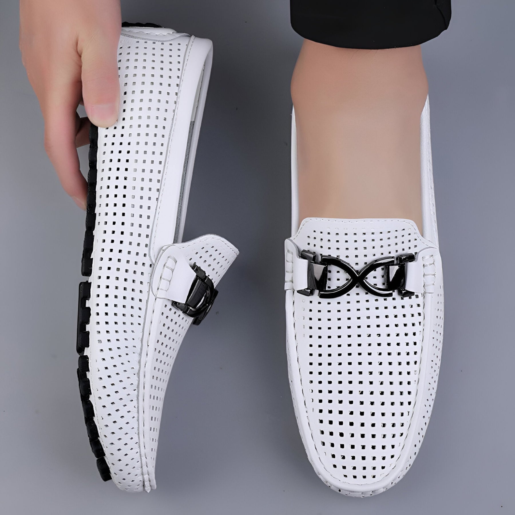 Dad‑level comfort. Italian looks. These genuine leather loafers feature a wide toe box, plush heel pad, and breathable perforated leather—perfect for everything from errands to grilling, pain‑free.