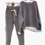 består av en lös, bekväm tröja och ett par avslappnade byxor med dragsko i