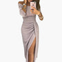 Upptäck den perfekta festklänningen för alla speciella tillfällen! Denna eleganta off shoulder-klänning för damer kombinerar stil med komfort och ger dig en sofistikerad look. Med sin figurnära siluett, smickrande drapering över höften och den djupa slitsen framtill får du en klänning som verkligen sticker ut och framhäver din feminina charm.